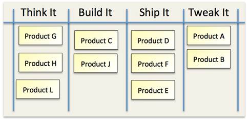 All major product initiatives go through four stages – “Think It”, “Build It”, “Ship It”, and “Tweak It”. Here’s a picture illustrating the flow from idea to product, and what comes out of each stage along the way. You’ll find a more detailed version of this picture at the end of the article.